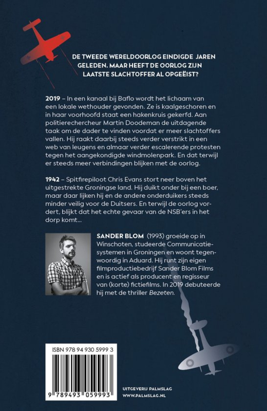 OverzichtDe Tweede Wereldoorlog eindigde decennia terug. Maar heeft hij zijn laatste slachtoffer al opgeëist? 2019 – In een kanaal bij Baflo wordt het lichaam van een lokale wethouder gevonden. Ze is kaalgeschoren en in haar voorhoofd staat een hakenkruis gekerfd. Aan politierechercheur Martin Doodeman de uitdagende taak om de dader te vinden voordat er meer slachtoffers vallen. Hij raakt daarbij steeds verder verstrikt in een web van leugens en almaar verder escalerende protesten tegen het aangekondigde windmolenpark. En dat terwijl er steeds meer verbindingen blijken met de oorlog. 1942 – Spitfirepiloot Chris Evans stort neer boven het uitgestrekte Groningse land. Hij duikt onder bij een boer, maar daar lijken hij en de andere onderduikers steeds minder veilig voor de Duitsers. En terwijl de oorlog vordert, blijkt dat het echte gevaar van de NSB’ers in het dorp komt... Auteur Sander Blom (1993) groeide op in Winschoten, studeerde Communicatiesystemen in Groningen en woont tegenwoordig in Aduard. Hij runt zijn eigen filmproductiebedrijf Sander Blom Films en is actief als producent en regisseur van (korte) fictiefilms. In 2019 debuteerde hij met de thriller 'Bezeten', die verkrijgbaar is als e-book en luisterboek.