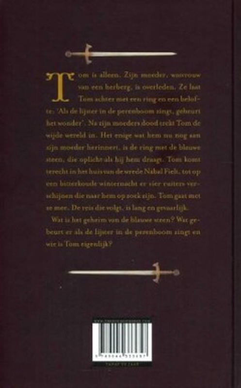 OverzichtTom is alleen. Zijn moeder, wasvrouw van een herberg, is overleden. Ze laat Tom achter met een ring en een belofte: 'Als de lijster in de perenboom zingt, kan het wonder gebeuren'. Na zijn moeders dood trekt Tom de wijde wereld in. Het enige dat hem nu nog aan zijn moeder herinnert, is de ring met de blauwe steen, die oplicht als hij hem draagt. Tom komt terecht in het huis van de wrede Nabal Fielt die de ring van hem steelt. Op een bitterkoude winternacht verschijnen er vier ruiters die op zoek zijn naar hem. Tom gaat met ze mee. De reis die volgt, is lang en gevaarlijk. Wat is het geheim van de blauwe steen? Wat gebeurt er als de lijster in de perenboom zingt en wie is Tom eigenlijk?