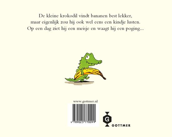 Een klein krokodilletje eet altijd bananen, maar op een dag heeft hij trek in iets anders. Hij zou wel eens een kindje lusten! Zijn ouders weten zich geen raad en proberen hem allerlei ander lekkers voor te schotelen. Maar het kleine krokodilletje is vastbesloten en gaat op zoek naar een kindje. Hij komt een meisje tegen, maar dat laat zich niet zomaar opeten...