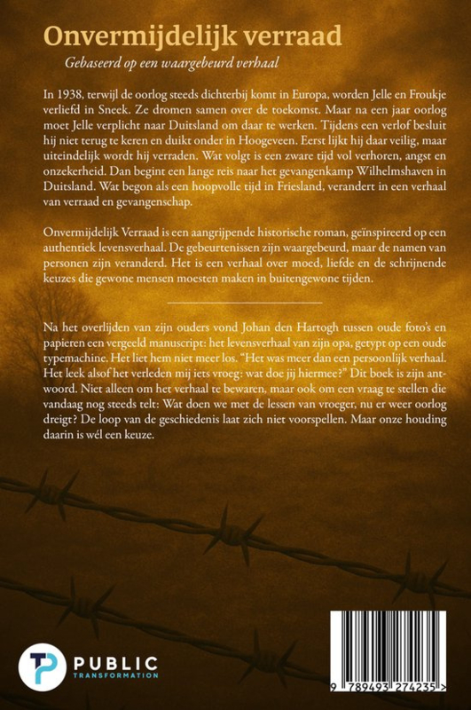 1938–1945. Terwijl de dreiging van oorlog in Europa steeds voelbaarder wordt, bloeit in het Friese Drachten de liefde tussen Jelle en Froukje. Tussen werk, water en dorpsleven dromen zij van een toekomst samen. Maar hun leven neemt een andere wending wanneer Nederland bezet wordt. Na een jaar bezetting wordt Jelle verplicht om in Duitsland te werken. Tijdens een verlof besluit hij niet terug te keren en duikt hij onder in Meppel. Aanvankelijk lijkt hij daar veilig, maar uiteindelijk wordt hij verraden. Wat volgt is een periode van verhoren, angst en onzekerheid. Daarna wordt hij afgevoerd naar het gevangenkamp Wilhelmshaven in Duitsland. Onvermijdelijk Verraad is een historische roman over liefde, moed en overleven in oorlogstijd. De oorsprong van het verhaal ligt in een vergeeld manuscript, getypt op een typemachine, dat de auteur ontdekte en waarin zijn opa zijn ervaringen uit de Tweede Wereldoorlog beschrijft. Zijn persoonlijke verhaal staat symbool voor de ervaringen van jonge mannen en gezinnen in Friesland, Drenthe en de rest van Nederland. Dit boek wil dat verhaal doorgeven en ons laten nadenken over wat het vandaag te zeggen heeft, nu oorlogsdreiging opnieuw voelbaar is. Aanbeveling: De oorlogservaringen, met het strafkamp als indringend hoogtepunt, zijn overtuigend tot leven gebracht. - Dr. Oebele Vries, historicus